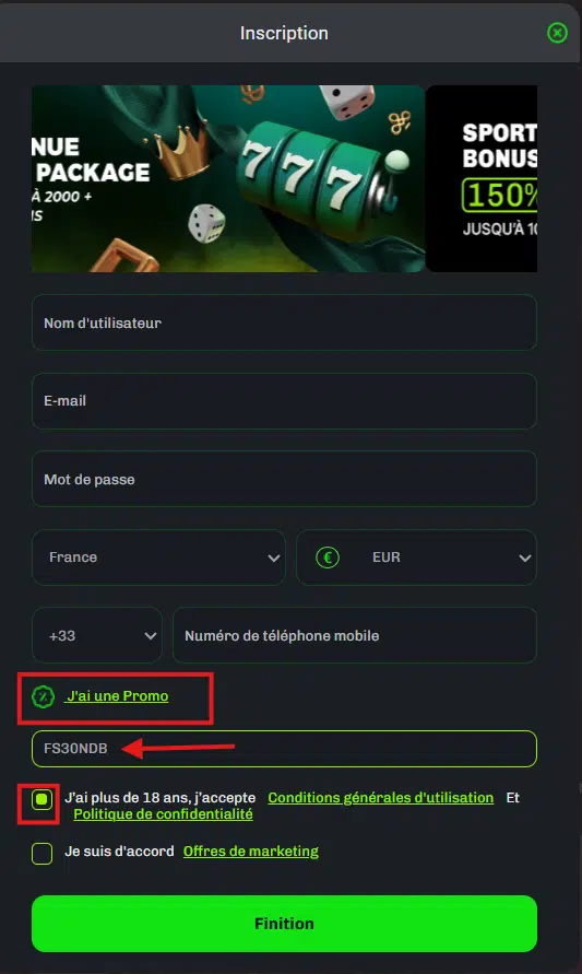 - Pour obtenir un bonus sans dépôt cochez la case « J’ai une promo » et inscrivez le code bonus sans dépôt indiqué plus haut.